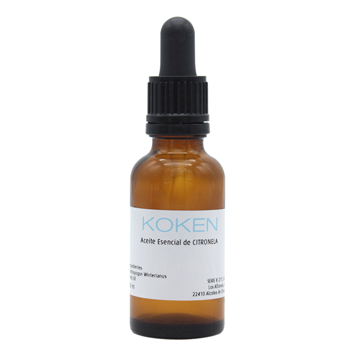 Aceite esencial de Citronela envasado en frasco de cristal de 30ml con cuentagotas dosificador.