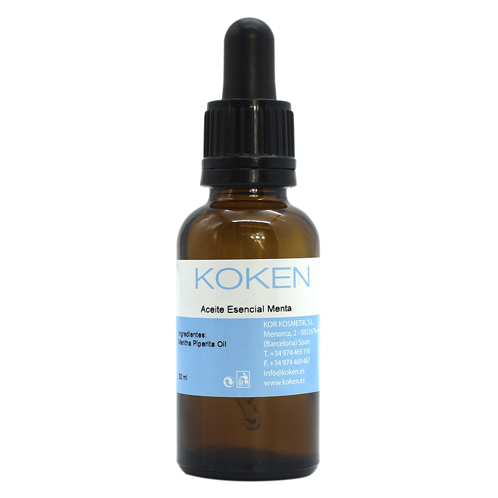 Aceite esencial de menta en envase de 30 ml de cristal ámbar con cuentagotas.