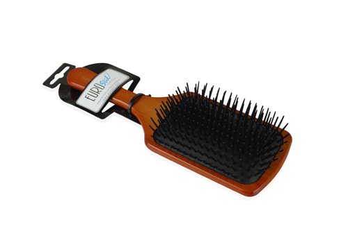 Cepillo plano con mango y estructura de madera con púas de plástico, indicada para desenredar sin tirones y peinar largas melenas aportando brillo y soltura tanto en centros profesionales como en casa.