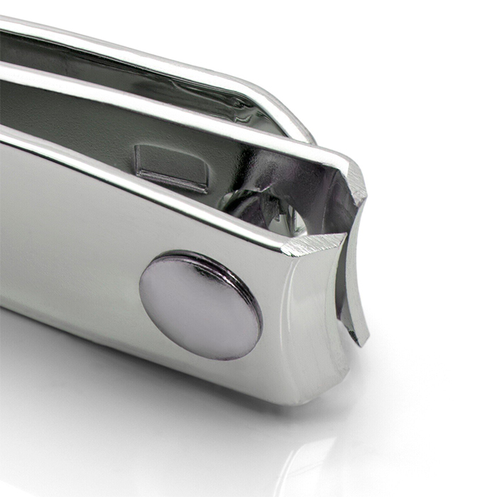 Cortauñas de tamaño grande fabricado en acero inoxidable, con acabado niquelado y cromado. Equipado con cuchillas curvas que se ajustan a la forma natural de la uña, ofreciendo un corte preciso y duradero.