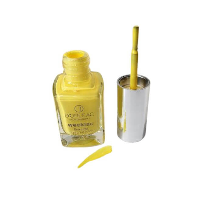 Esmalte D’Orleac Weeklac Amarillo 13 ml: consigue una manicura de gel brillante y duradera durante una semana sin necesidad de lámpara UV. Fórmula libre de tolueno, formaldehído y DBP, fácil de aplicar y retirar con quitaesmalte sin acetona. Color amarillo vibrante que se mantiene impecable día tras día.