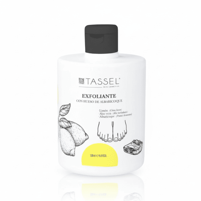 Exfoliante de Pies Tassel 500 ml: hueso de albaricoque y perlite para eliminar asperezas; con aloe, glicerina y ácido hialurónico para hidratar y dejar los pies suaves.