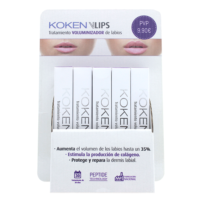 KOKEN Vlips es un potente tratamiento voluminizador labial que permite incrementar el volumen de los labios hasta un 35%, mediante su alto contenido en: