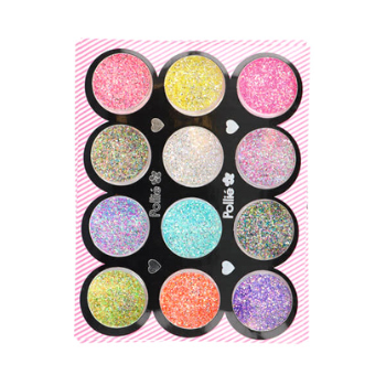 12 tarros de purpurina para uñas en distintos colores. Son el complemento perfecto para creaciones de Nail Art, manicuras y pedicuras.