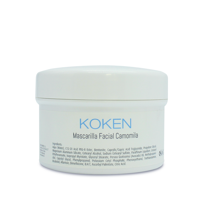 Envase de 250 ml de mascarilla facial de camomila. Su principal principio activo es la manzanilla que es suavizante, cicatrizante, calmante, antiinflamatoria, protectora, desensibilizador.