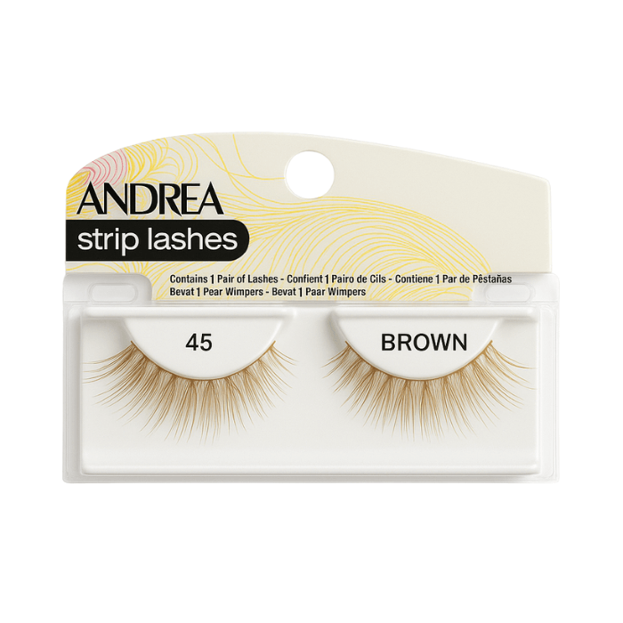 Pestañas Andrea SM 45 marrones. Curvatura lifting, tono natural y banda cómoda. Fáciles de aplicar y reutilizables. Tu mirada, pero mejor.