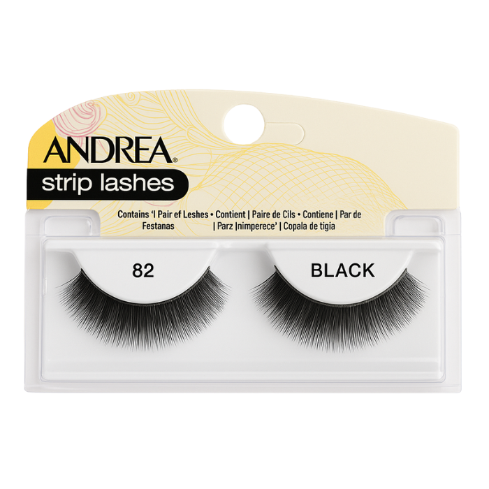 Pestañas Andrea 82 negras. Curvatura suave, diseño ligero y efecto alargador. Fáciles de aplicar y perfectas para un look sutil pero impactante.