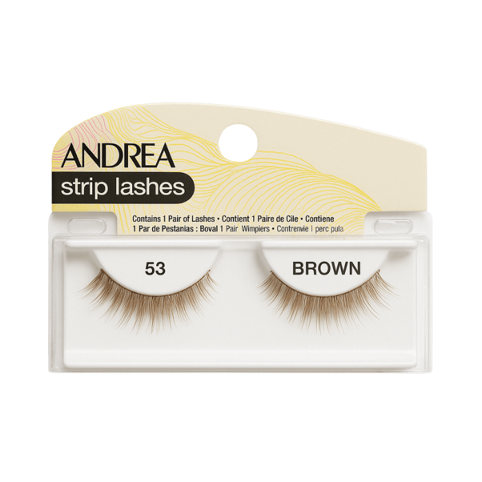 Pestañas Andrea SM 53 marrones. Tono cálido, efecto alargado y banda fina. Fáciles de aplicar y reutilizables. Tu mirada más natural empieza aquí.